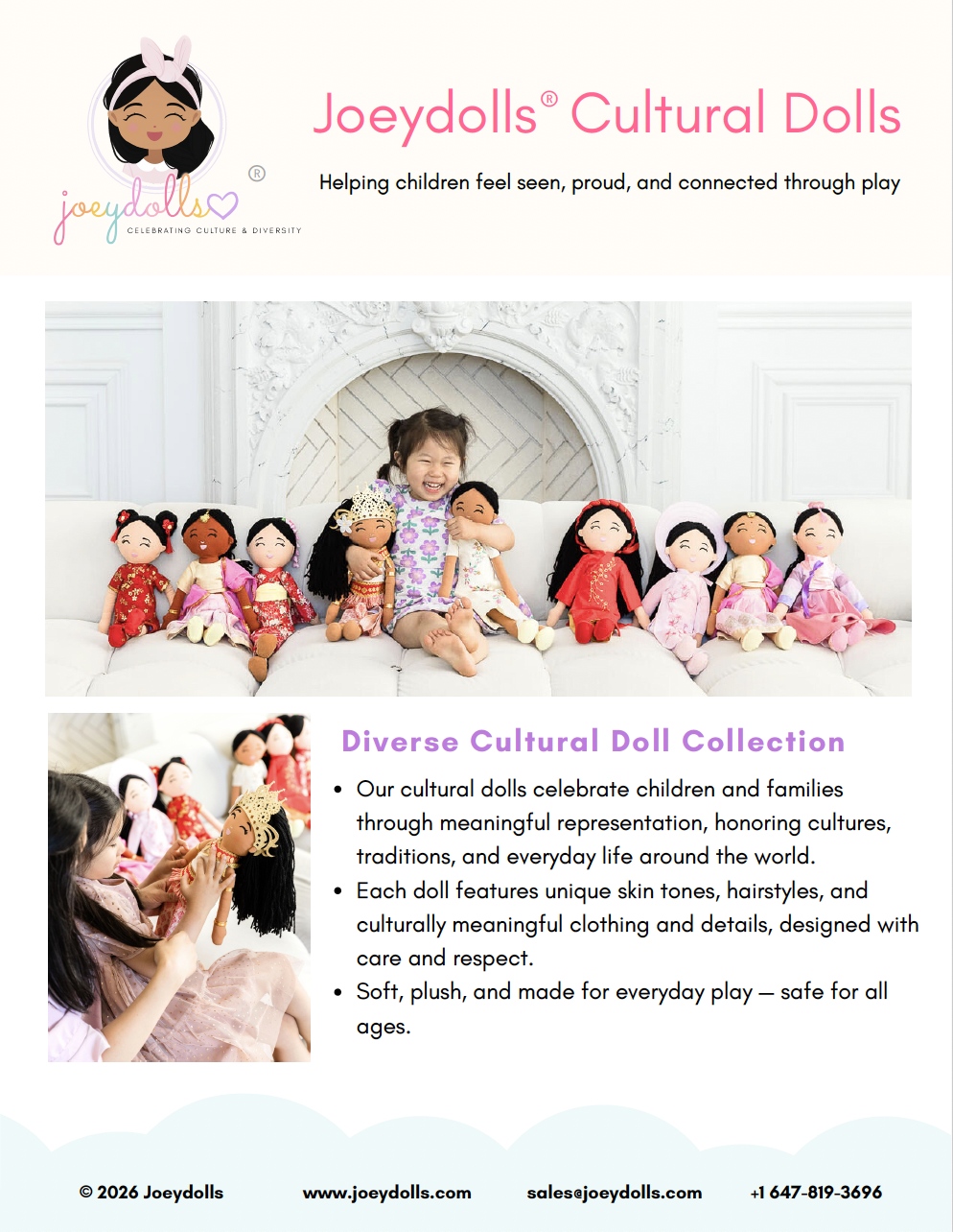 More than just a doll brand, Joeydolls is a movement—one that creates meaningful cultural connections through play. Featuring the world’s most diverse line of Asian cultural dolls, each Joeydoll is thoughtfully designed to honor the rich traditions, stories, and heritage found across Asia.